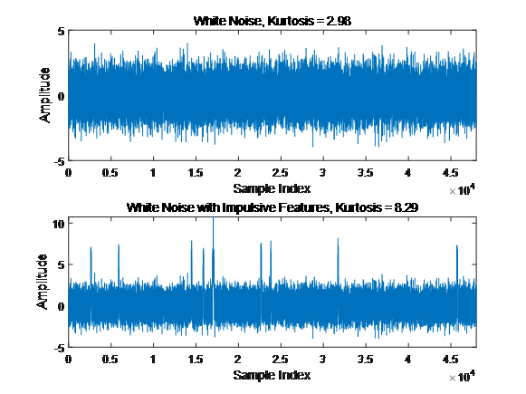 這樣服從正態(tài)分布的數(shù)據(jù)的峰度值為0,因?yàn)檎龖B(tài)分布的四階中心矩與方差平方的比值恰好等于3。簡(jiǎn)單來(lái)說(shuō),峰度可以用來(lái)描述信號(hào)的非平穩(wěn)特性,尤其是短時(shí)間內(nèi)突發(fā)的噪聲干擾,如果一段數(shù)據(jù)的峰度值越大,則表明該段數(shù)據(jù)中含有的突發(fā)性噪聲干擾成分較多。下面以一段數(shù)據(jù)分析對(duì)比為例,采用信號(hào)仿真方法生成一組隨機(jī)白噪聲信號(hào)和一組添加有突發(fā)性沖擊干擾的白噪聲信號(hào),分別計(jì)算兩組信號(hào)的峰度值可以發(fā)現(xiàn),含有突發(fā)性沖擊特征干擾的白噪聲信號(hào)的峰度值為8.29,明顯大于不含有干擾的白噪聲信號(hào)2.98。